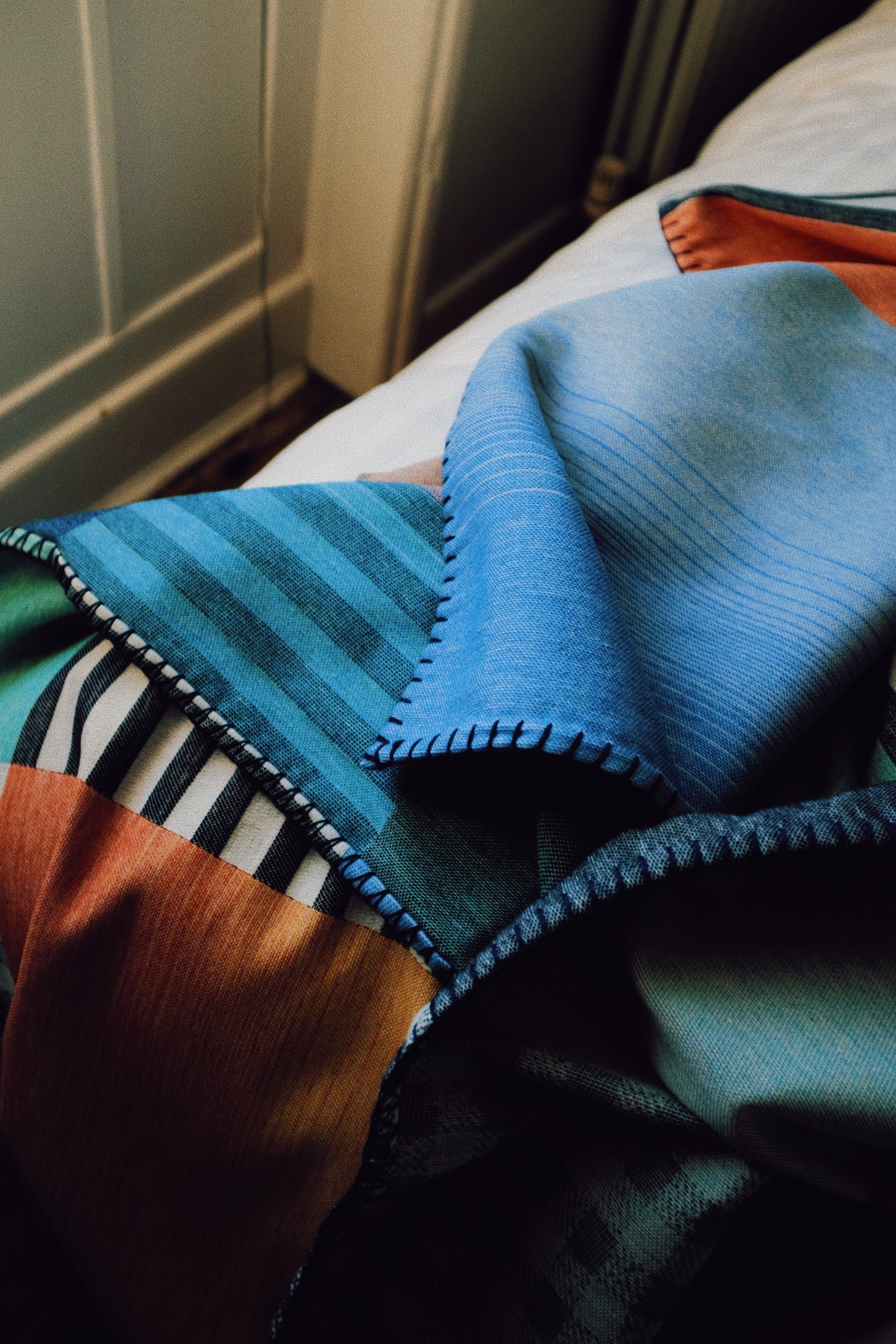By using a cotton warp and merino wool weft, these throws have a very distinct, drier feel than your average couch throw - specifically designed so that they, A. age better & B. hold their own structure a little more & therefore are more usable outside of winter. Finished off with a Blanket Stitch.